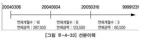 [그림 Ⅲ-4-33]은 [표 Ⅲ-4-3]에 있는 123번 고객에 대한 3개의 선분이력 레코드를 일직선 상에 펼쳐서 그려본 것이다.