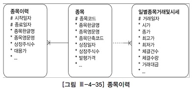물론 방금 쿼리는 종목 테이블을 종목이력과 통합해 하나로 설계했을 때 사용하는 방식이다. [그림 Ⅲ-4-35]처럼 종목과 종목이력을 따로 설계했을 때는 최종 시점을 위해 종목 테이블과 조인하면 된다.
