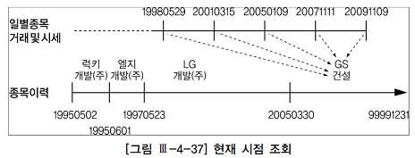 이런 식으로 조회하면 현재(=최종) 시점의 종목명을 가져오는 것이 아니라 [그림 Ⅲ-4-36]에서 보는 것처럼 거래가 일어난 바로 그 시점의 종목명을 읽게 된다.