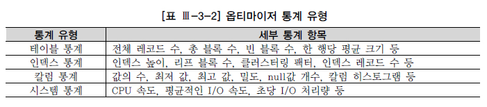 실행계획을 수립할 때 CBO는 SQL 문장에서 액세스할 데이터 특성을 고려하기 위해 통계정보를 이용한다. 최적의 실행계획을 위해 통계정보가 항상 데이터 상태를 정확하게 반영하고 있어야 하는 이유다. DBMS 버전이 올라갈수록 자동 통계관리 방식으로 바뀌고 있지만, 가끔 DB 관리자가 수동으로 수집관리해 주어야 할 때도 있다. 옵티마이저가 참조하는 통계정보 종류로 아래 네 가지가 있다.