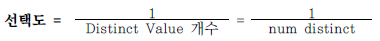 - 카디널리티 = 총 로우 수 × 선택도 = num_rows / num_DISTINCT