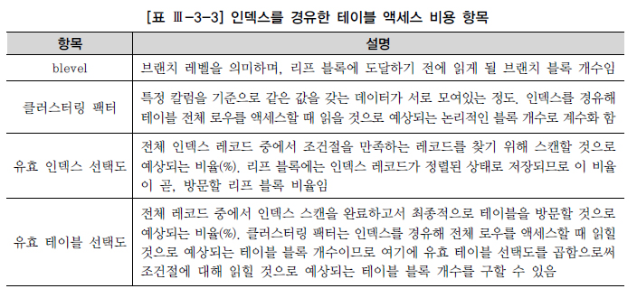 I/O 비용 모델에서의 비용은 디스크 I/O Call 횟수(논리적/물리적으로 읽은 블록 개수가 아닌 I/O Call 횟수)를 의미한다. 그리고 인덱스를 경유한 테이블 액세스 시에는 Single Block I/O 방식이 사용된다. 이는 디스크에서 한 블록을 읽을 때마다 한 번의 I/O Call을 일으키는 방식이므로 읽게 될 물리적 블록 개수가 I/O Call 횟수와 일치한다. 따라서 인덱스를 이용한 테이블 액세스 비용은 아래와 같은 공식으로 구할 수 있다. 비용 = blevel – 인덱스 수직적 탐색 비용 + (리프 블록 수 × 유효 인덱스 선택도) – 인덱스 수평적 탐색 비용 + (클러스터링 팩터 × 유효 테이블 선택도) – 테이블 random 액세스 비용? 그림 -