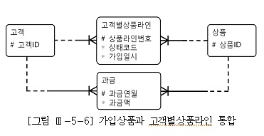 PK 외에 관리할 속성이 아예 없거나 [그림 Ⅲ-5-5]의 ‘가입상품’처럼 소수(여기서는 가입일시 하나뿐임)일 때, 테이블 개수를 줄인다는 이유로 자식 테이블에 통합시키는 경우를 종종 볼 수 있다. ‘가입상품’ 테이블을 없애고 [그림 Ⅲ-5-6]처럼 ‘고객별상품라인’에 통합하는 식이다.