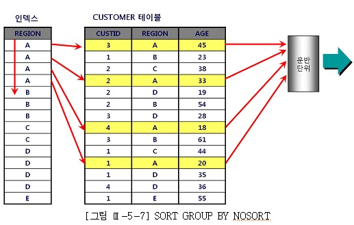 방금 본 customer 테이블 예시에서 region이 선두 칼럼인 결합 인덱스나 단일 칼럼 인덱스를 사용하면 아래 쿼리에 필요한 sort GROUP BY 연산을 대체할 수 있다. 실행계획에 ‘SORT GROUP BY NOSORT’라고 표시되는 부분을 확인하기 바란다.