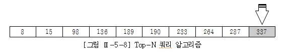 예를 들어 Top 10 (rownum < = 10)이면, [그림 Ⅲ-5-8]처럼 우선 10개 레코드를 담을 배열을 할당하고 처음 읽은 10개 레코드를 정렬된 상태로 담는다. (위에서 예시한 쿼리는 거래일시 순으로 정렬하고 있지만, 설명을 단순화하려고 숫자로 표현하였다.)