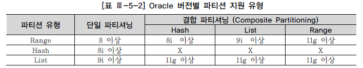 Oracle 버전별 파티션 지원 유형을 요약하면 [표 Ⅲ-5-2]와 같다.