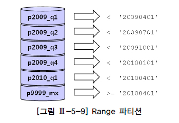 Oracle에서 Range 파티셔닝하는 방법([그림 Ⅲ-5-9] 참조)을 간단히 예시하면 다음과 같다.