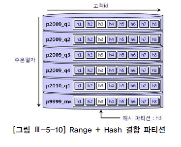 Oracle에서 [Range + Hash]로 파티셔닝하는 방법([그림 Ⅲ-5-10] 참조)을 간단히 예시하면 다음과 같다.