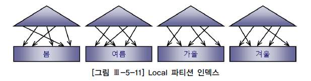 - Local 파티션 인덱스 : 테이블 파티션과 1:1로 대응되도록 파티셔닝한 인덱스([그림 Ⅲ-5-11] 참조). 인덱스 파티션 키를 사용자가 따로 지정하지 않으며, 테이블과 1:1 관계를 유지하도록 DBMS가 자동으로 관리해 줌. SQL Server에선 ‘정렬된(aligned) 파티션 인덱스’라고 부름