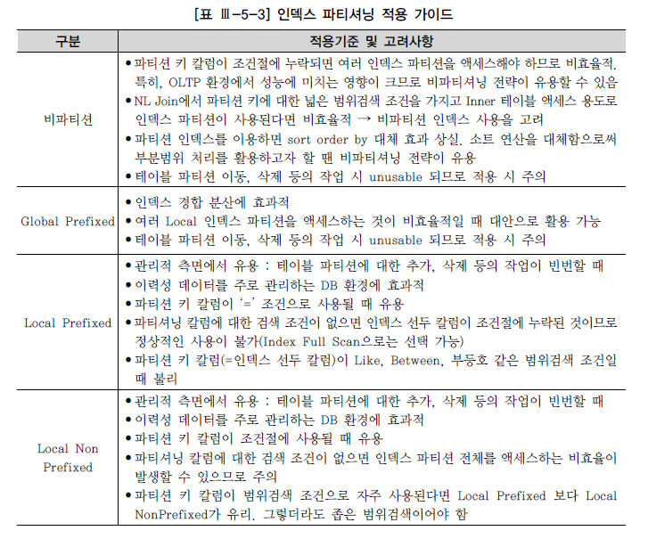 인덱스 파티션은 파티션 테이블과 마찬가지로 성능, 관리 편의성, 가용성, 확장성 등을 제공한다. 테이블에 종속적인 Local 파티션, 테이블과 독립적인 Global 파티션 모두 가능하지만, 관리적인 측면에서는 Local 인덱스가 훨씬 유용하다. 테이블 파티션에 대한 Drop, Exchange, Split 등의 작업 시 Global 인덱스는 Unusable 상태가 되기 때문이다. 인덱스를 다시 사용할 수 있게 하려면 인덱스를 Rebuild 하거나 재생성해 주어야 한다. 성능 측면에서는 [표 Ⅲ-5-3]과 같이 다양한 적용기준을 고려해야 하므로 잘 숙지하기 바란다.