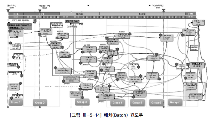 On-Demand 배치의 등장으로 온라인 프로그램과의 경계가 모호해져, 사실 온라인과 배치로 양분하는 것 자체가 무의미하게 느껴질 수도 있다. 하지만 배치 프로그램에서의 성능 목표와 튜닝 기법은 온라인 프로그램에서의 그것과 달라야 한다. 온라인 프로그램은 경우에 따라 전체 처리속도 최적화나 최초 응답속도 최적화를 목표로 선택하지만, 배치 프로그램은 항상 전체 처리속도 최적화를 목표로 설정해야 한다. 개별 프로그램 차원에서도 그렇지만 야간에 수행되는 전체 배치 프로그램에 대한 목표도 마찬가지다. 개별 서비스 또는 프로그램을 가장 빠른 속도로 최적화하더라도 전체 배치 프로그램 수행시간을 단축시키지 못하면 무의미하다. 튜닝 대상을 선정할 때도 이런 기준을 갖고 선별해야 한다. 자원 사용 측면도 중요한 고려사항이다. 자원에 대한 경합이 극심한 상황에선 프로그램들이 정상적으로 진행하기 어렵기 때문이다. 그런 측면에서 보면, 병렬도(DOP, degree of parallelism)를 32로 지정해서 5분이 소요되는 프로그램을 병렬 처리 없이 10분이 소요되도록 하는 것이 오히려 나을 수 있다. 시스템 자원을 독점적으로 사용하도록 설정된 프로그램을 찾아 병렬도를 제한하고, 동시에 수행되는 프로그램 개수도 적절히 유지해야 한다. 실제 개발 프로젝트에 가 보면, 시스템 자원에 대한 사용 권한을 적절히 배분하지 않고 각 서브 개발 파트에서 개발한 배치 프로그램을 12시 정각에 동시에 수행하는 경우를 종종 볼 수 있다. 그럴 때 배치 윈도우(Batch Window)를 적절히 조절하는 것만으로 배치 프로그램 수십 개를 튜닝한 것과 같은 효과를 내기도 한다. 원리는 간단하다. 같은 시간대에 수많은 프로그램이 집중적으로 수행되면 자원(CPU, Memory, Disk 등)과 Lock(Latch와 같은 내부 Lock까지 포함)에 대한 경합이 발생하기 때문이다. 그러면 프로세스가 실제 일한 시간보다 대기하는 시간이 더 많아지므로 총 수행시간이 늘어나는 것이다. 상용 툴(Tool)을 이용하면 좋겠지만, [그림 Ⅲ-5-14]처럼 오피스용 문서를 이용해서도 충분히 배치 윈도우를 관리할 수 있다.