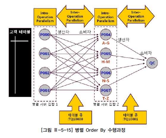[그림 Ⅲ-5-15]는 ORDER BY를 포함하는 위 병렬 쿼리의 수행과정을 도식화한 것이다.