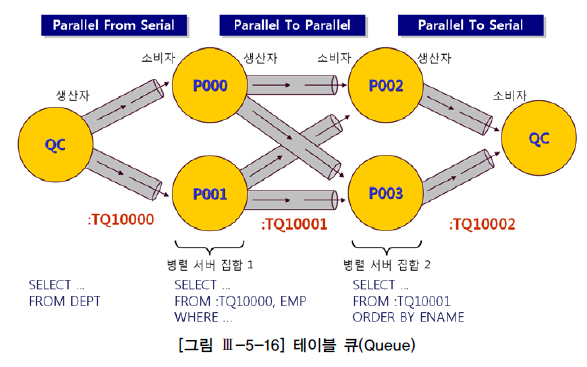 테이블 큐에는 항상 생산자(Producer)와 소비자(Consumer)가 존재한다. [그림 Ⅲ-5-16]을 보면, 처음 dept 테이블을 읽어 분배하는 :TQ10000에서는 QC가 생산자고 서버 집합 1이 소비자다. 이어지는 두 번째 테이블 큐 :TQ10001에서는 서버 집합 1이 생산자가 되고, 서버 집합 2가 소비자가 된다. 마지막으로, 정렬된 최종 결과집합을 전송하는 :TQ10002에서는 서버 집합 2가 생산자가 되고 QC가 소비자가 된다. SELECT 문장에서의 최종 소비자는 항상 QC일 것이다. [그림 Ⅲ-5-16]에서 보듯 Inter-Operation Parallelism이 나타날 때, 소비자 서버 집합은 FROM절에 테이블 큐를 참조하는 서브(Sub) SQL을 가지고 작업을 수행한다.