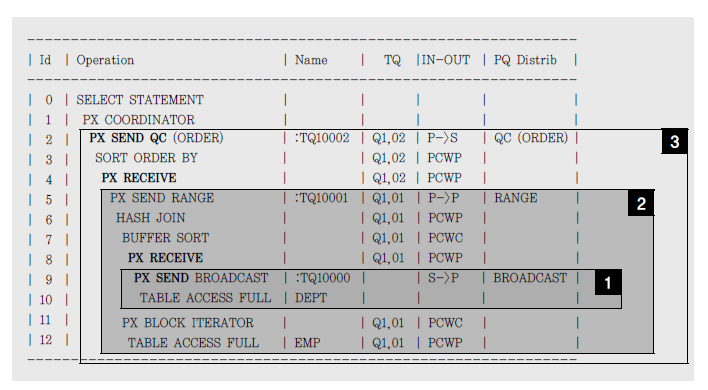 Id Operation Name TQ IN - OUT PQ Distrib 1 SORT AGGREGATE 2 PX COORDINATOR 3 PX SEND QC (random) :TQ10002 Q1, 02 P - >S QC (RAND) 4 SORT AGGREGATE Q1,02 PCWP 5 HASH JOIN Q1,02 PCWP 6 BUFFER SORT Q1,02 PCWC 7 PX RECEIVE Q1,02 PCWP 8 PX SEND HASH :TQ10000 S->P HASH 9 TABLE ACCESS FULL DEPT 10 PX RECEIVE Q1,02 PCWP 11 PX SEND HASH :TQ10001 Q1,01 P->P HASH 12 PX BLOCK ITERATOR Q1,01 PCWC 13 TABLE ACCESS FULL EMP Q1,01 PCWP