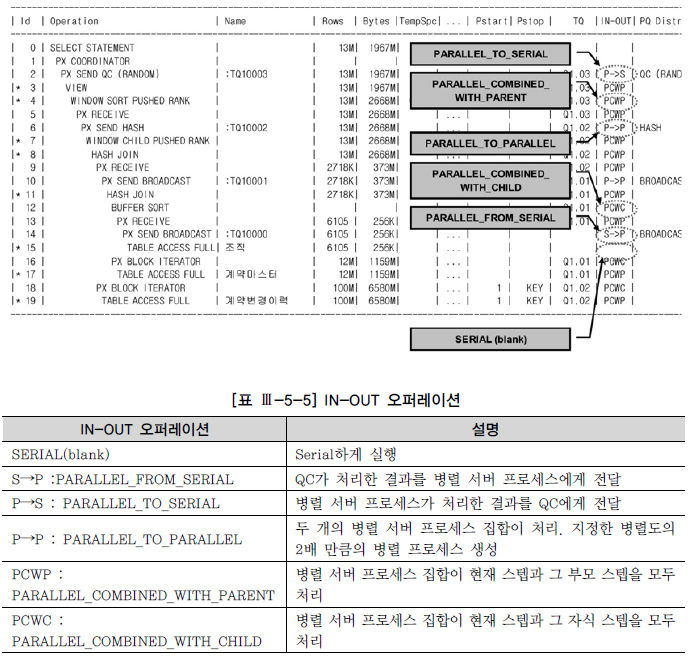 각 오퍼레이션이 어떤 서버 집합에 속한 병렬 프로세스에 의해 수행되는지는 ‘TQ’ 칼럼(4번째 칼럼)에 보이는 서버 집합 식별자를 통해 확인할 수 있다.
