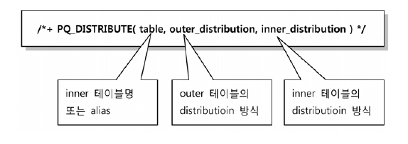 조인되는 양쪽 테이블의 파티션 구성, 데이터 크기 등에 따라 병렬 조인을 수행하는 옵티마이저의 선택이 달라질 수 있다. 대개 옵티마이저의 선택이 최적이라고 할 수 있지만 가끔 그렇지 못한 경우가 있다. 그럴 때 pq_distiribute 힌트를 사용함으로써 옵티마이저의 선택을 무시하고 사용자가 직접 조인을 위한 데이터 분배 방식을 결정할 수 있다.