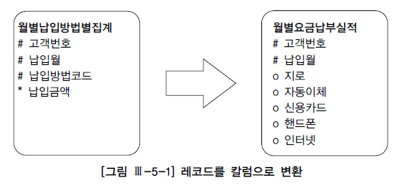 [그림 Ⅲ-5-1] 왼쪽에 있는 월별납입방법별집계 테이블을 읽어 오른쪽 월요금납부실적과 같은 형태로 가공하려고 한다.