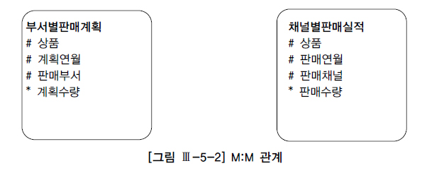 M:M 관계의 조인을 해결하거나 Full Outer Join을 대체하는 용도로 UNION ALL을 활용할 수 있다. [그림 Ⅲ-5-2]처럼 부서별판매계획과 채널별판매실적 테이블이 있다. 이 두 테이블을 이용해 월별로 각 상품의 계획 대비 판매 실적을 집계하려고 한다. 그런데 상품과 연월을 기준으로 볼 때 두 테이블은 M:M 관계이므로 그대로 조인하면 카티션 곱(Cartesian Product)이 발생한다.