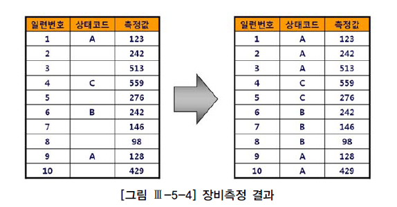 그런데 장비측정 결과를 조회할 땐, 사용자가 [그림 Ⅲ-5-4] 우측과 같이 출력해 주길 원한다. 즉 상태코드가 NULL이면 가장 최근에 상태코드가 바뀐 레코드의 값을 보여주는 식이다. 이를 구현하기 위해 가장 쉽게 생각할 수 있는 방법은 다음과 같다.